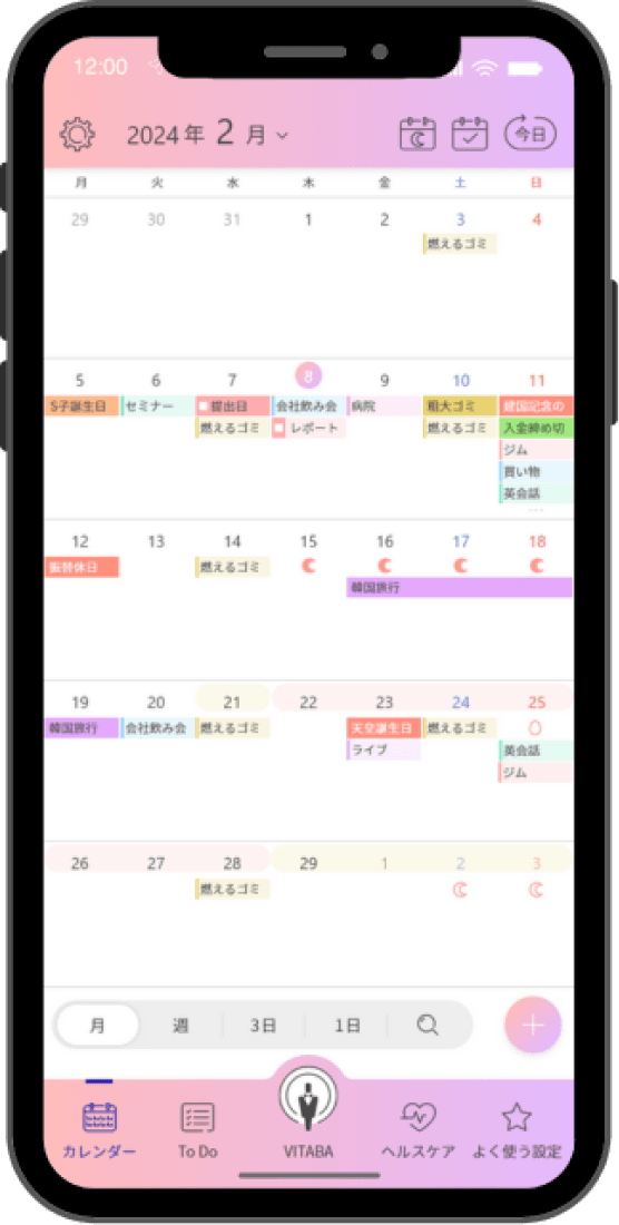 VITABAはカレンダーやToDoリストとも連携し、あなたの生活をしっかりとサポート。スケジュール管理や期限付きタスクの管理など、忙しい毎日をVITABAがうまく立ち回れるよう全力でバックアップします。